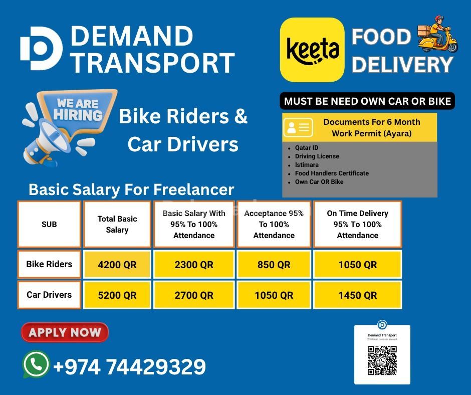 Demand Transport & Services is hiring drivers for Keeta Food Delivery across Qatar. Candidates must have their own car or bike.